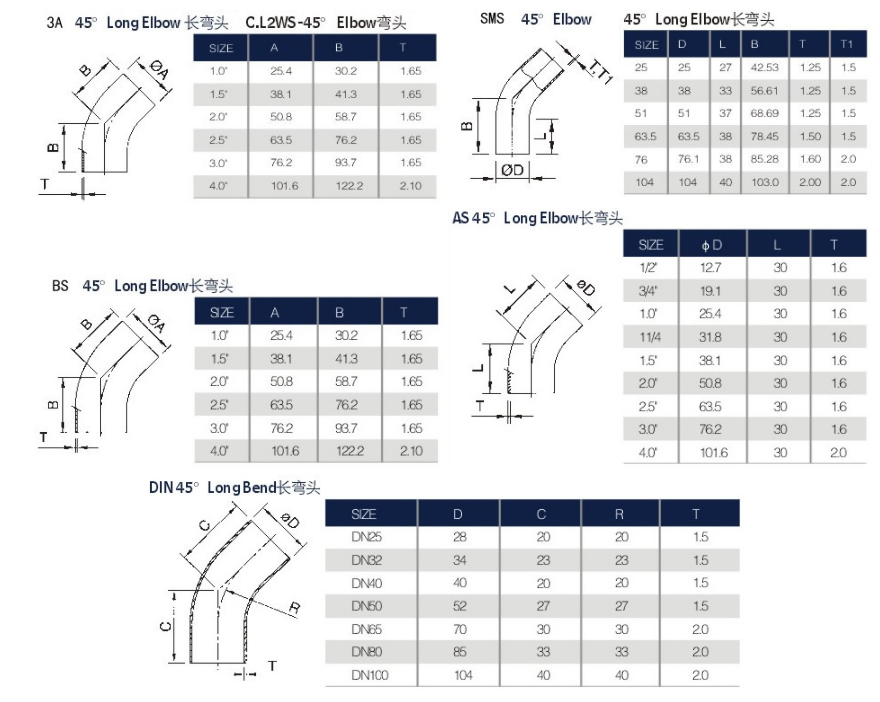 衛(wèi)生級焊接45 °度長彎頭
